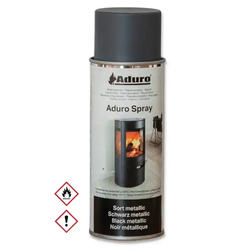 Boks med spraylakk med samme sort-farge som de fleste Aduro Peis, hybrid og noen Pelletsovner. Med denne sprayboksen er det fort gjort å reparere små skader i lakken.