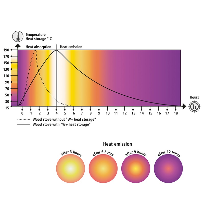 • Integrert W+ varmelagringsstein: Veier 85 kg, denne funksjonen lagrer varme effektivt og gir opptil 10 timer med mild varmeavgivelse etter at flammene har dødd ut, ulikt modeller uten slik lagring.