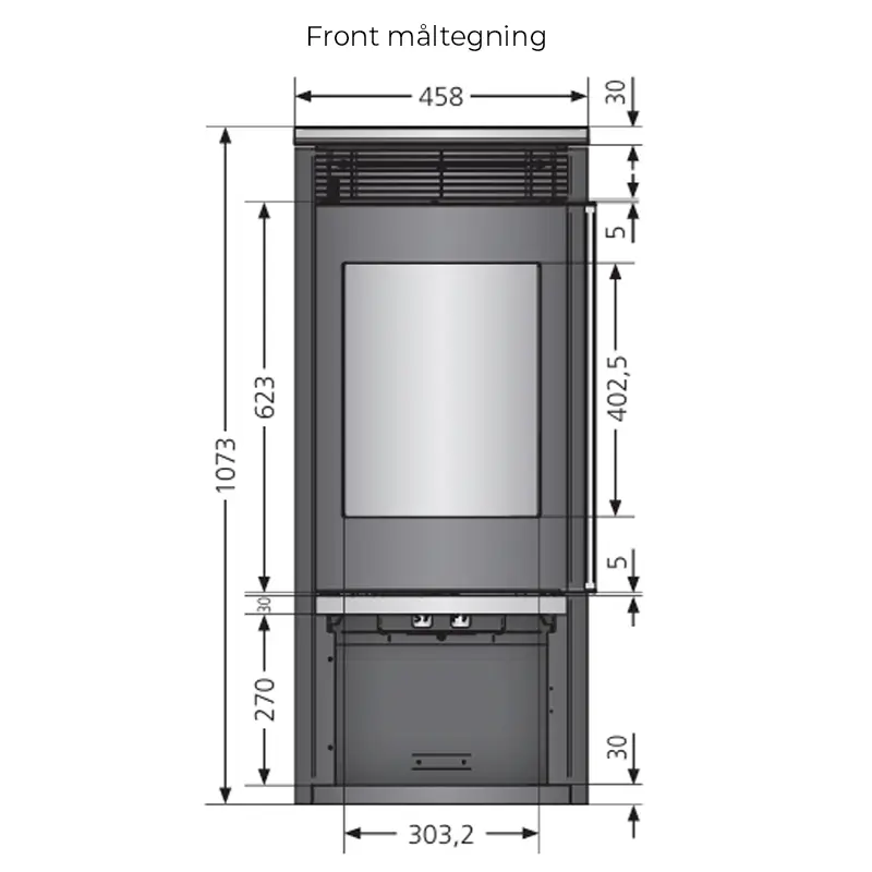 - Stort frontglass med luftspyling – gir godt innsyn til flammene og holder glasset rent under fyring.